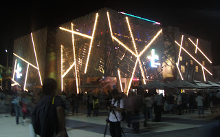 and as soon as i exited, the first shot of a pavilion that i took at night was the swedish one, glowing with intersecting channels of light on its circuit-like exterior walls, and i could see how the utilization of creative lighting techniques would now show a whole new way of looking the pavilions of the expo.